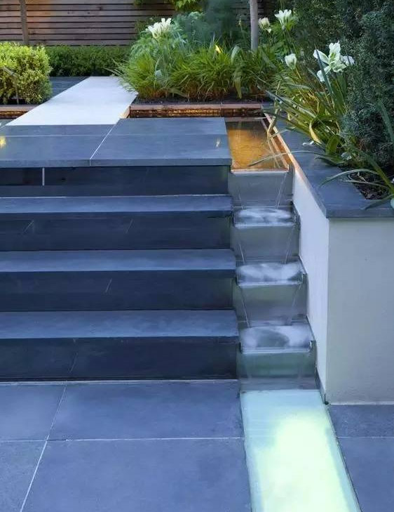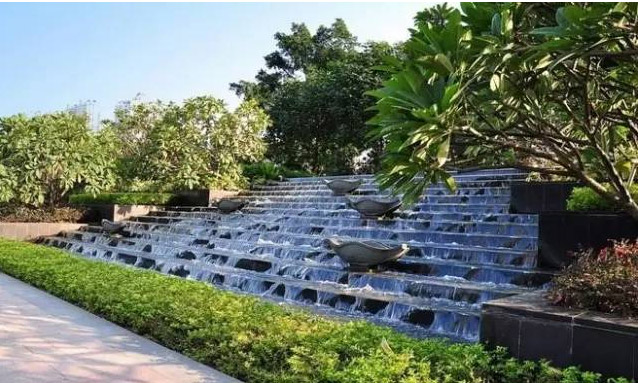 噴泉中的水分層連續(xù)流出,或呈臺階狀稱為疊水。“有山皆是園,無水不成景”,高低錯(cuò)落的臺階,清脆悅耳的潺潺流水,給人以回歸自然的享受。
