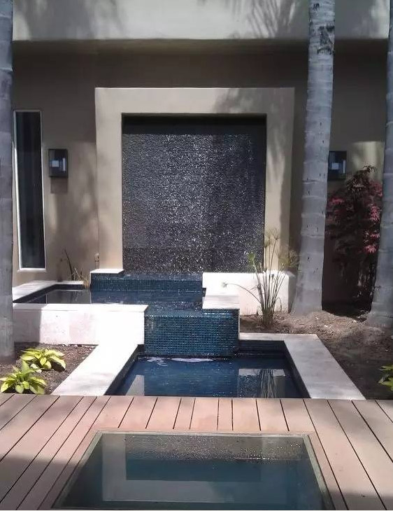 跌水是指規(guī)則形態(tài)的落水景觀,多與此同時(shí)建筑、景墻、擋土墻等結(jié)合,跌水表現(xiàn)了水的墜落之美。