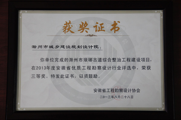 安徽省工程勘察設計協(xié)會于2013年8月3日組織專家召開安徽省優(yōu)秀工程勘察設計行業(yè)獎評審會,對全省共62家單位上報的320個項目進行了為期兩天的評選。由我院市完成的滁州市瑯琊古道綜合整治工程建設項目在2013年度安徽省優(yōu)秀勘察設計行業(yè)評選中,榮獲三等獎。