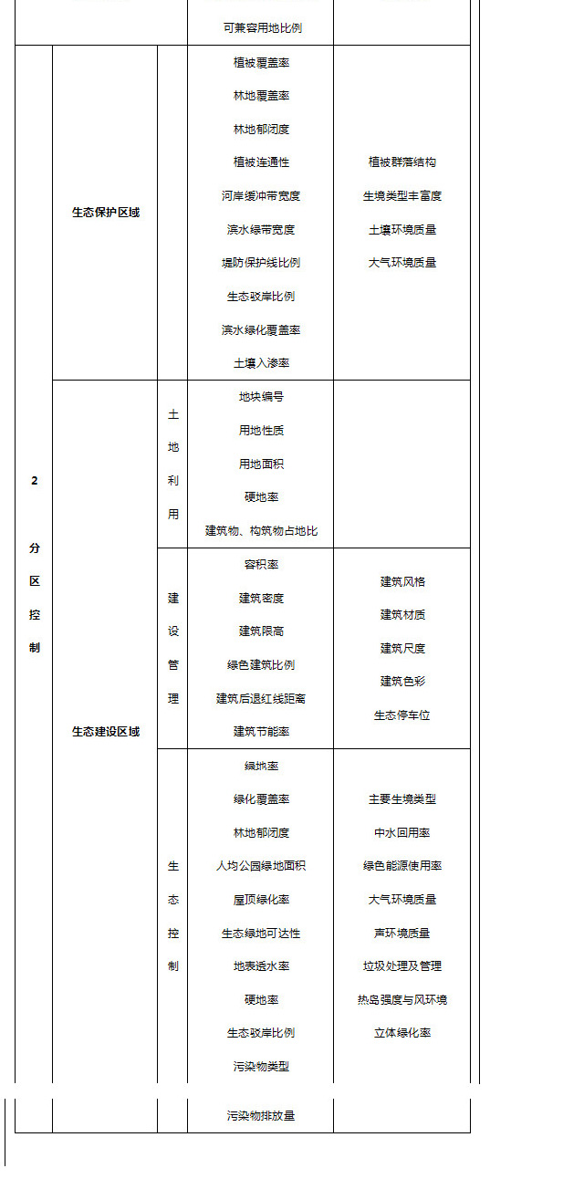 生態(tài)控制類的控制性指標包括綠地率、綠化覆蓋率、林地郁閉度、人均公園綠地、屋頂綠化率、生態(tài)綠地可達性、地表透水率、硬地率、生態(tài)駁岸比例、污染物排放量等;引導性指標包括主要生境類型、中水回用率、綠色能源使用率、大氣環(huán)境質量、聲環(huán)境質量、垃圾處理及管理、熱島強度與風環(huán)境、立體綠化率等。