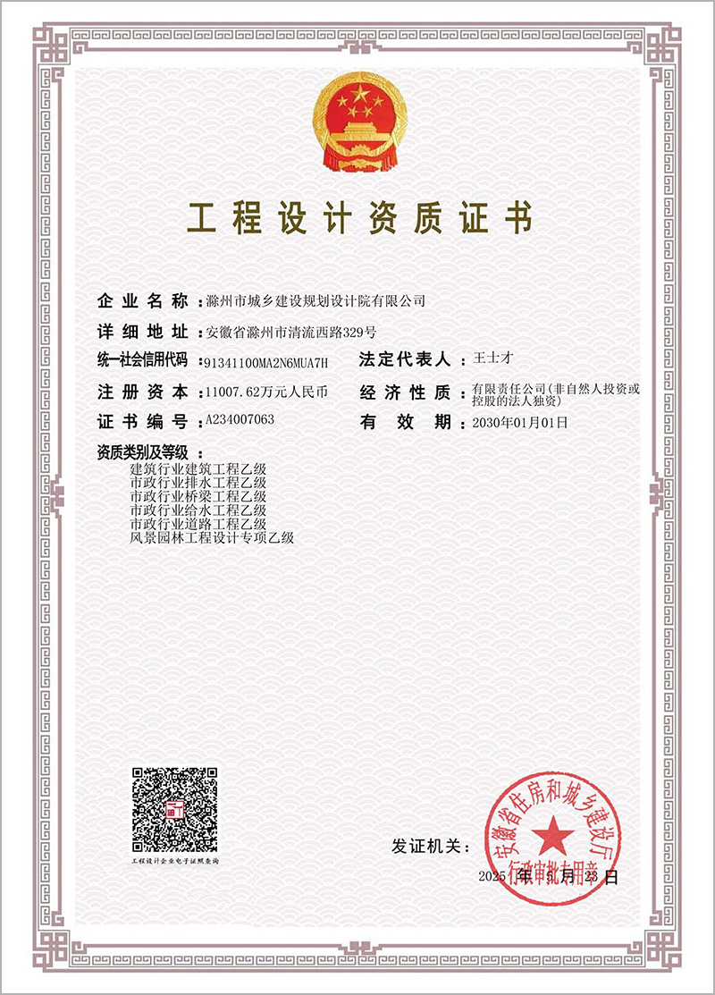 工程設計資質證書(建筑、排水、橋梁、給水、道路、風景園林)