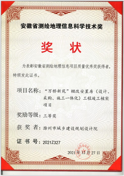 滁州市經(jīng)開區(qū)地形圖測繪規(guī)劃獲獎證書